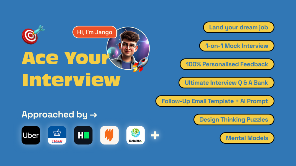 What You’ll Get: ✅ Mock Interview (30 min) + Feedback & Strategy Session (15 min) ✅ Follow-Up Email Template + AI Prompt ✅ Ultimate Product Design Q&A Bank ✅ Design Thinking Problems (with Sample Responses) ✅ Mental Models to Think Like a Top Designer
